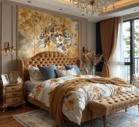 A vintage hotel room exudes timeless charm with its classic furnishings, featuring elegant wood-paneled walls, antique-style lamps, and ornate floral-patterned wallpaper. The room is decorated with rich, plush fabrics like velvet curtains and a cozy, quilted bedspread. Soft, warm lighting creates an inviting atmosphere, while vintage accessories such as a brass clock, vintage suitcases, and retro artwork complete the nostalgic feel. The blend of old-world sophistication and comfort offers a step back in time, perfect for guests seeking a romantic or historic escape.